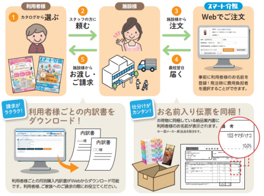 また、施設利用者ご自身がスマート介護の幅広い品揃えから商品を選んでお買い物ができる「お買い物サポートサービスCOREIL(コレイル)」は、施設利用者、スタッフから高い支持を得ており、本カタログでも詳しくその利便性を紹介しています。