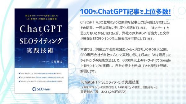 「ChatGPT×SEOライティング実践技術 ~東京SEOメーカーが試みたAI新時代の検索上位獲得法~」は、弊社のメディア「東京SEOメーカー」で実際に試したChatGPTの出力記事がどのように出力されSEO上位表示したのかを、すべて公開しています。