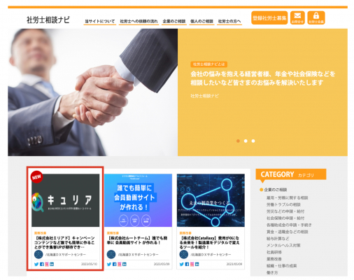 株式会社ミリアド(本社:東京都渋谷区、代表取締役:CEO 樋口 清政)が運営する、スマホコンテンツ制作システム「キュリア」は、社会保険労務士法人ファウンダー(本社:北海道札幌市、代表:米田 正則)が運営する「社労士相談ナビ」の、2023年5月10日に公開された「DX化に向けてサポートしてくれる優良企業 特集」に取り上げられたことをお知らせいたします。