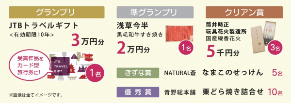 グランプリ受賞者には、受賞作品をカードにした世界に1枚だけの旅行券をお届けします。他、浅草今半のすき焼き肉、希少な国産の線香花火、京都・精華町の名産品「なまこのせっけん」など。