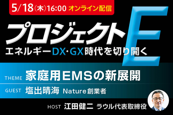 番組では、エネルギースタートアップ分野で活躍するベンチャー企業トップをゲストに招き、DX、GX、エネルギー危機などあらゆる課題が立ちはだかるニューノーマル時代のビジネス展開に迫ります。第3回のゲストはNature創業者の塩出晴海氏です。司会は、エネルギー関連のコンサルティングや講演を行う、RAUL株式会社代表の江田健二が務めます。