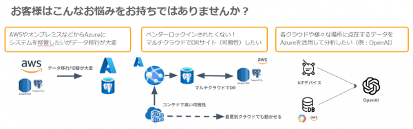 コンテナ技術の発展に伴い、アプリケーションは可搬性を担保することが可能となりましたが、一方でデータベースを中心としたデータマイグレーションや移行はまだまだ大変です。Aivenを活用することで、現在ご利用中のクラウドのPostgreSQLやMySQLなどのデータをMicrosoft Azureへ数クリックの操作で短期間にマイグレーションすることが可能です。パブリッククラウドやエッジに点在するデータリソースの集約も可能です。AivenのデータサービスとAzureのクラウドネイティブなサービスを連携させた、可搬性が高くベンダーロックインされない柔軟なシステムアーキテクチャの設計と構築支援をサポートします。