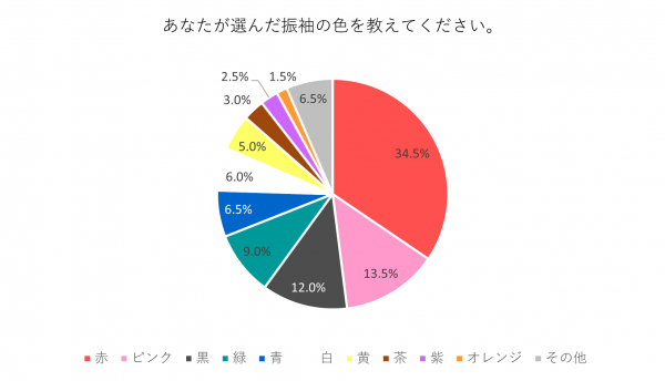 今回実施したアンケートによると、3人に2人が正統派古典を選んでいることが明らかになりました。また成人式で着用した振袖の色をたずねたところ、「赤」が最も多く34.5%、次いで「ピンク」13.5%となり、合わせて49%が暖色系の振袖を選んでいたこともわかりました。人とかぶらない振袖を着たいのであれば、茶や紫、オレンジなどが良さそうです。