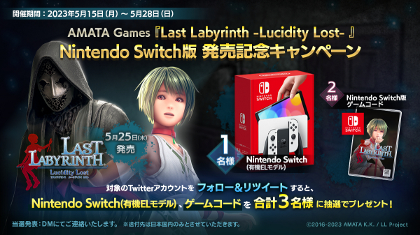 『Last Labyrinth -Lucidity Lost-』のSwitch版の発売を記念して、Twitterフォロー&リツイートキャンペーンを実施します。