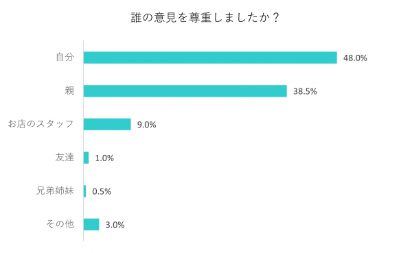 「自分」48%、「親」38.5%、「お店のスタッフ」9%、「友達」1%、「兄弟姉妹」0.5%、「その他」3%という結果でした。