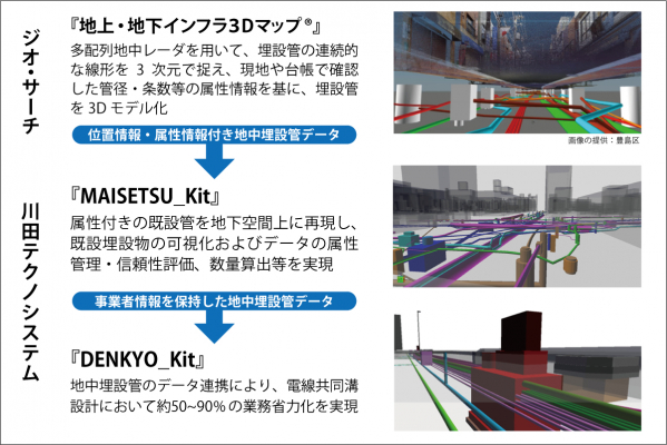 また、ジオ・サーチ社の計測結果から作成された既設管モデルは、川田テクノシステム社の電線共同溝設計システム『DENKYO_Kit』を活用することにより、電線共同溝設計において約50~90%の業務省力化(川田テクノシステム社調べ)を実現します。