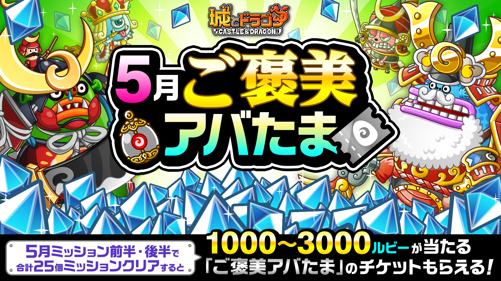 「5月ミッション」前半(5月15日(月)で開催終了)と、5月16日(火)からスタートする後半、双方のミッションの中から合計25個クリアすると、“ご褒美アバたまチケット”を1枚もらえます。このチケットは1000~3000ルビーが当たる特別なアバたま「ご褒美アバたま」を回す際に必要となるチケットです。