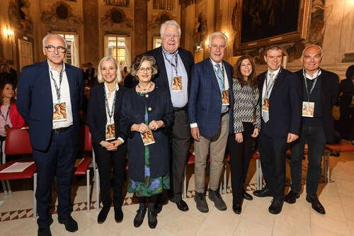 Nicola Armentano (City of Florence Councillor), Lucia Aleotti (Menarini Group Shareholder and Board Member), Cristina Acidini (Author of the Botticelli art monograph), Eric Cornut (Menarini Group Chairman), Eugenio Giani (President of Region of Tuscany); Elcin Barker Ergun (Menarini Group CEO), Alberto Giovanni Aleotti (Menarini Group Shareholder and Board Member) and Carlo Colombini (Menarini Group Board Member)
