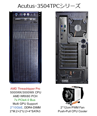 Acutus 3504TPCシリーズは、LGA4094ソケット(ソケットsWRX8/SP3r4)のAMD Ryzen Threadripper PRO 5000WX/3000WXプロセッサーを搭載したシステムで、それぞれ4ベイの3.5インチと2.5インチHDD/SSDベイを装備しています。