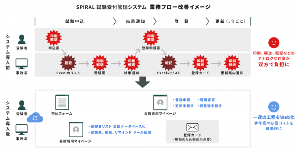 試験運営の一連の流れをWebで行えるようになったことで、課題だった書類記入や郵送の手間は大きく削減され、事務局および受験者双方での利便性が高まりました。また、受験者の情報管理もExcelから「SPIRAL ver. 1」でのデータベース管理に移行したことで、事務局の業務全体が効率化でき、2.5人分の事務工数の削減だけでなく、印刷費、郵送費、人件費などのコスト削減にも成功しました。