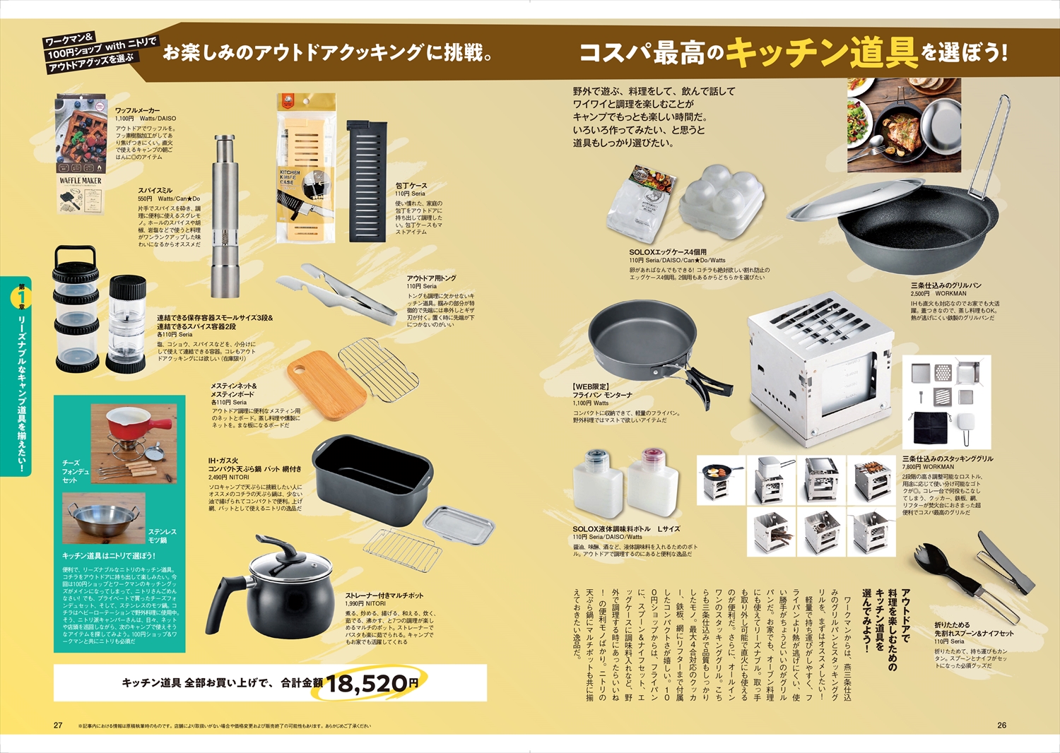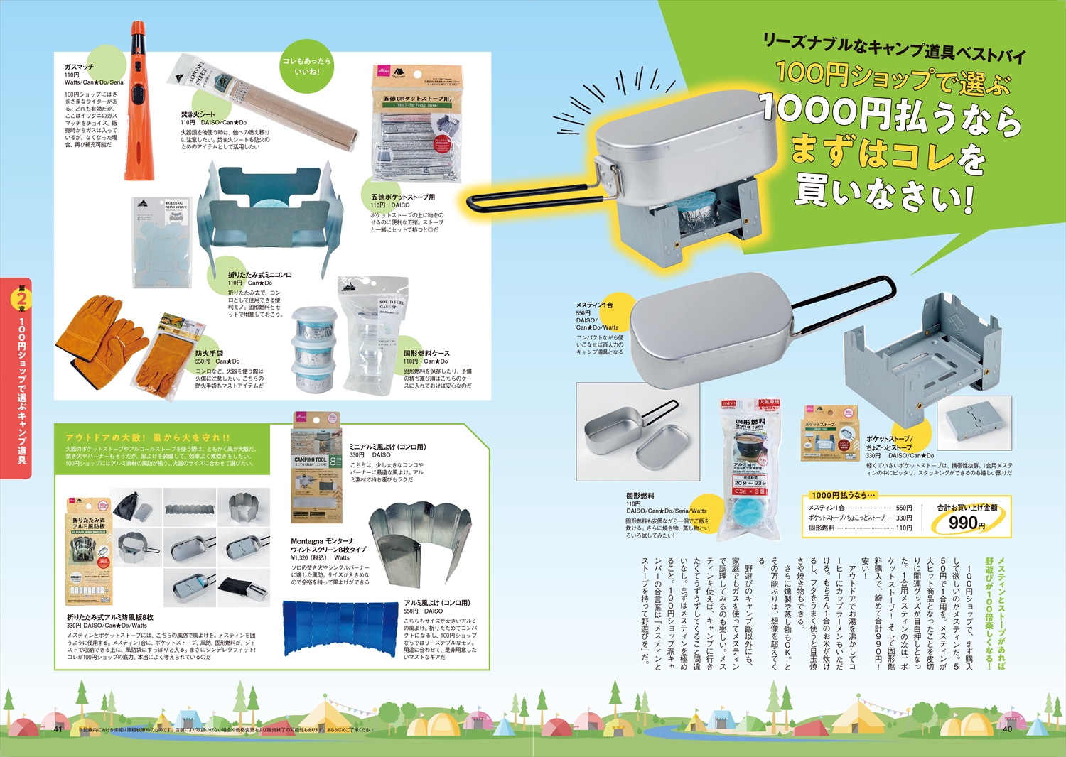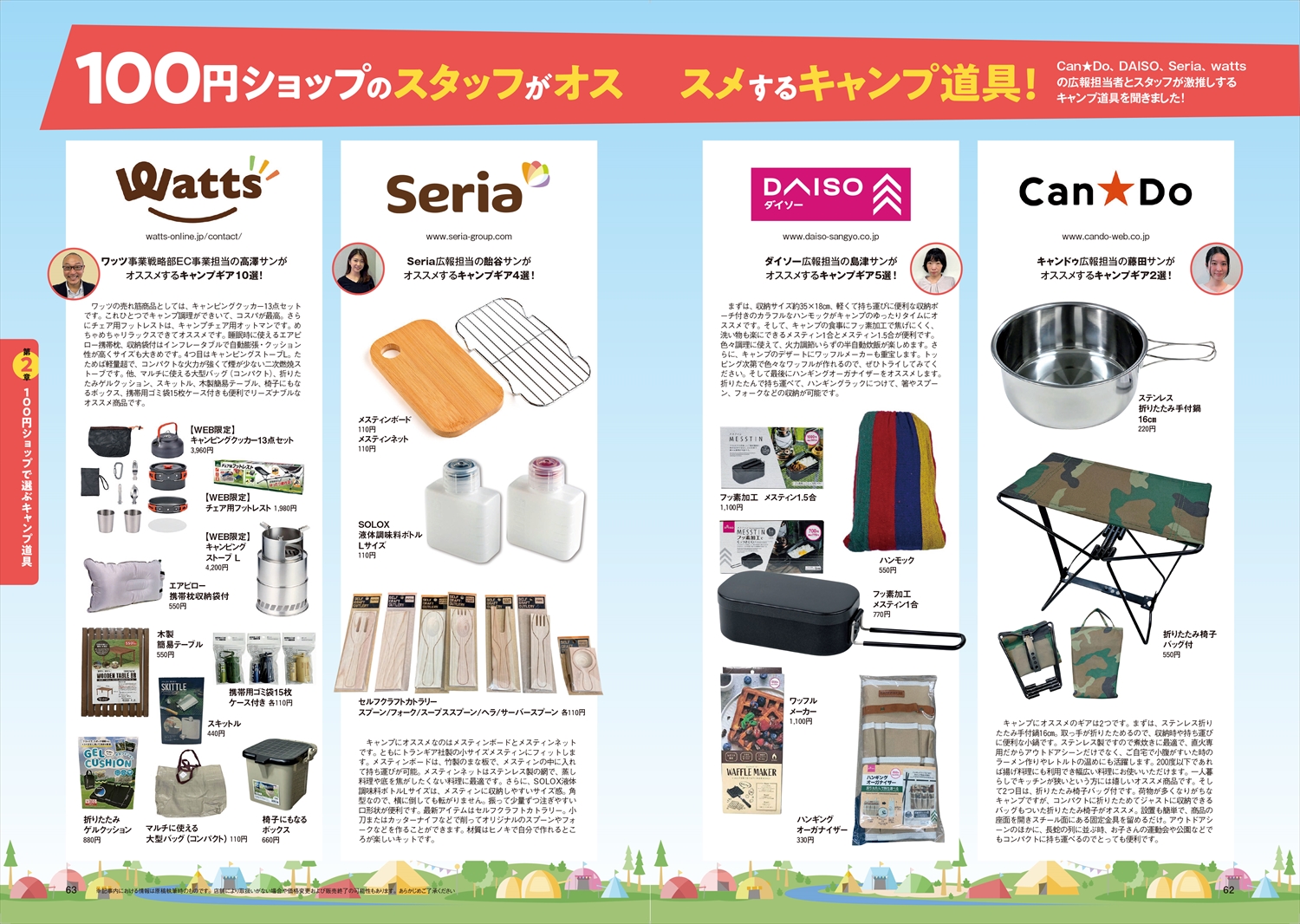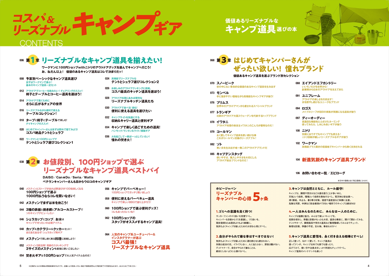 はじめてのキャンプの道具を選ぶキャンパーさんも、少しずつキャンプ道具を増やしているコレからキャンパーさんも、安いものには疑いの目を向けてしまうベテランキャンパーさんにも、安価だけど使えるアイテム、長く使えるコストパフォーマンス最強のキャンプ道具を、一冊まるごと徹底レビューいたします。