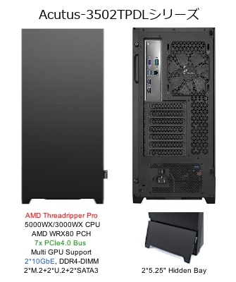 (ミドルタワー, AMD Ryzen Threadripper Pro 5000WX/3000WX CPU, 簡易冷却ユニット(500W+), AMD WRX80 PCH, 7*PCIe4.0(X16)バス, DDR4 DIMM, 2*SATA3, 2*M.2 & 2*U.2 NVMe SSD, 2*10GbE, 850W 80Plus ゴールド規格ATXプラグイン方式電源)