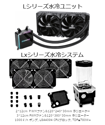 簡易水冷仕様のTPDLモデルでは、2台の12cm PWMファン、240mm x 39mmラジエーター、流量450/時のポンプにより500W+までのTDPに対応します。CPU冷却システム仕様のTPDLxモデルでは、5台の12cm PWMファン、240mm x 30mm と360mm x 44mmのラジエーター、最大流量1000/時のPWMポンプにより、780Wを超えるTDPに対応します。(1)