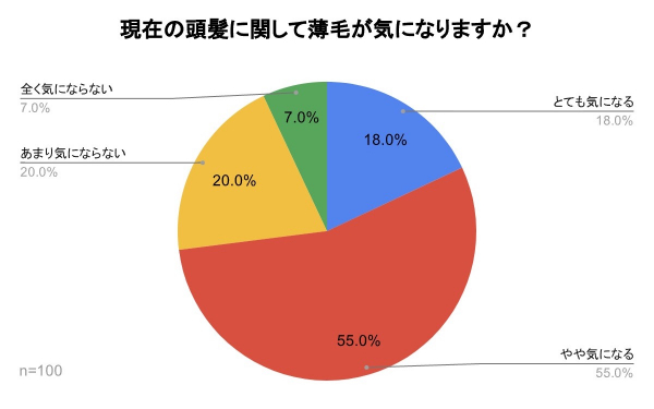 「現在の頭髪に関して薄毛が気になりますか?」のアンケート調査を行ったところ、『とても気になる』の18%、『やや気になる』の55%を合計した73%の人が自分の薄毛・ハゲを気にしていることがわかりました。7割以上と大多数の人にとって薄毛・ハゲは大きな悩み事であることがわかりました。