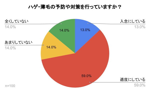 「ハゲ・薄毛の予防や対策を行っていますか?」のアンケート調査を行ったところ、『入念にしている』の13%、『適度にしている』の59%を合計した72%の人が薄毛対策、ハゲ予防を行っていることがわかりました。