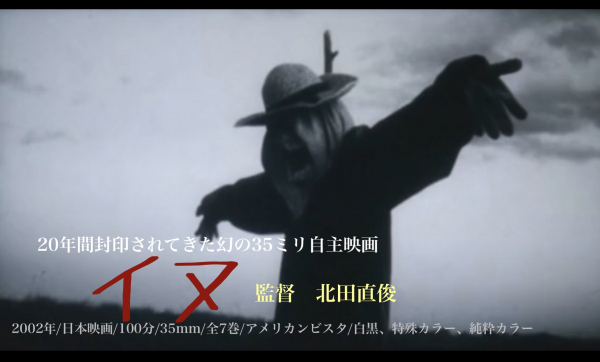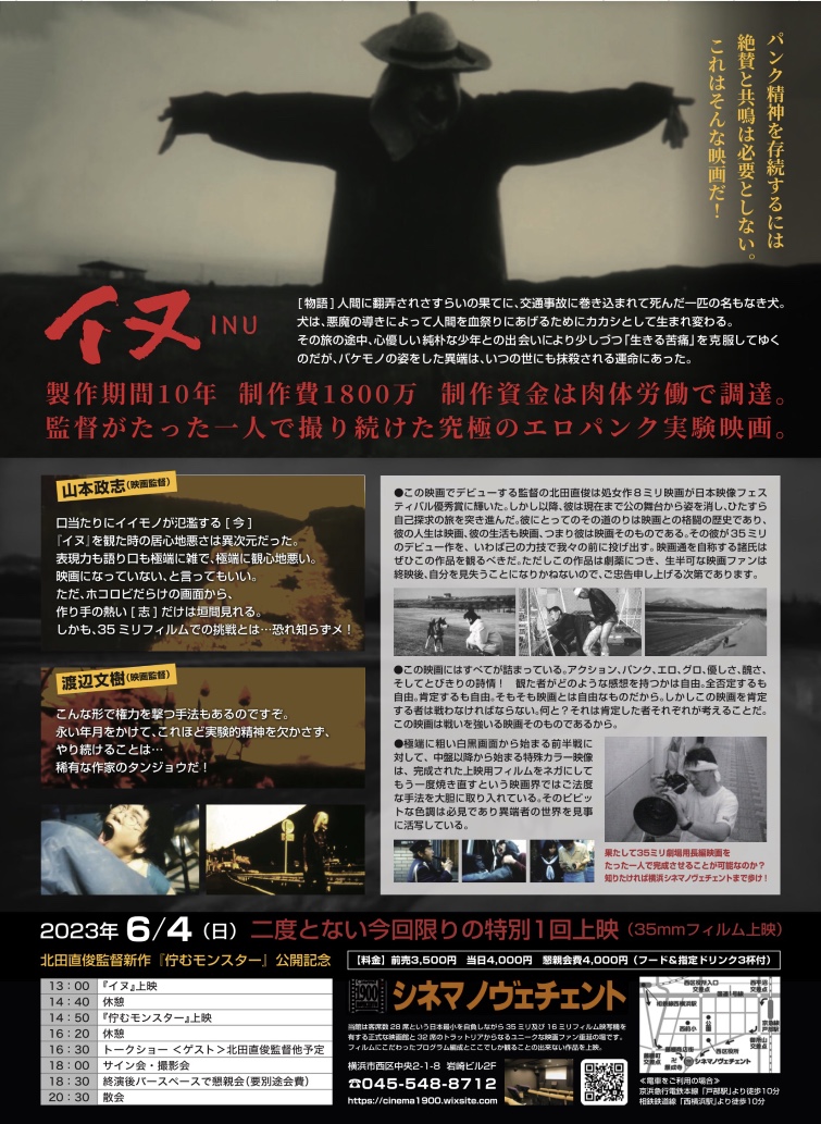 「みえない汚染・飯舘村の動物たち」「アジア犬肉紀行」など、社会的テーマを題材にした衝撃ドキュメンタリー映画制作を行う合同会社adg-ethics(本社:東京都杉並区、代表:北田 直俊)は、最新作となる社会派Jホラー「佇むモンスター」(2023年/90分)の公開を記念して、初期制作のシュールなモンスター映画『イヌ』(2002年/100分/35ミリ/7巻)を、2023年6月4日(日)13時から横浜シネマノヴェチェン(28席)にて35ミリフィルムで上映します。