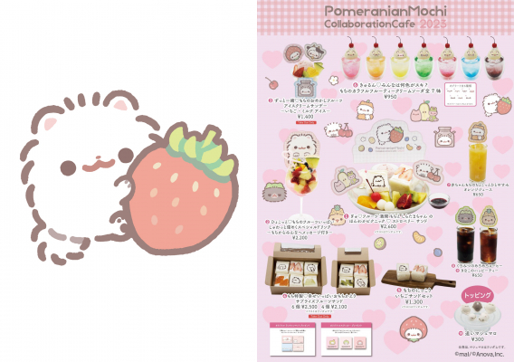 「ポメラニアンもち」のコラボカフェは今回が第3弾となります。ドリンクやフードのメニューは作者のmalが監修。季節のフルーツを使ったかわいらしいメニューが盛りだくさんとなっています。malが描き下ろしたイラストを使用したグッズも販売します。