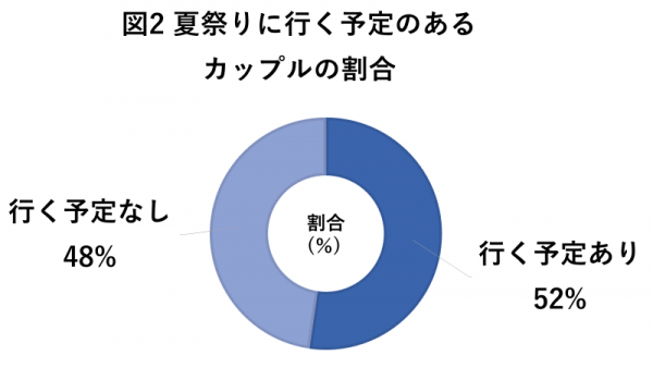 今年夏祭りに行く予定があるカップルは52%に対し、行く予定がないカップルは48%。