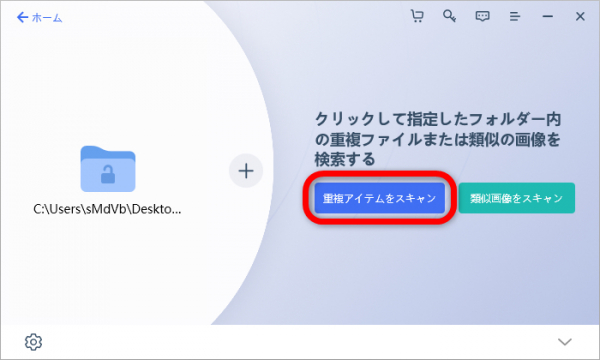 目的のフォルダーを選択して赤枠「フォルダーの選択」をクリックします。赤枠「重複アイテムをスキャン」をクリックします。