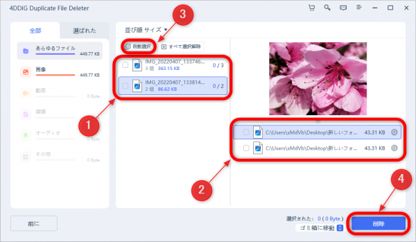 一つひとつ手作業でチェックを入れるのが面倒な場合は、(3)の「自動選択」をクリックすると、重複ファイルの中の最新のファイル以外すべてにチェックが入ります。