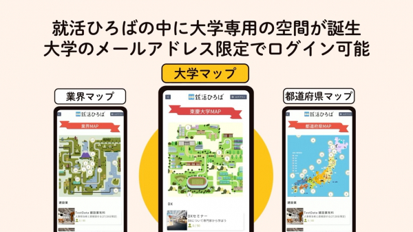 先進的な取り組みをする約20の大学のキャリアセンターと協働し、大学専用空間を就活ひろば内にオープンします。この空間は、所属する学生の生徒しか入れず、かつ、大学が選定したOB採用実績のある企業等のみに入室を制限することで、学生様にとってホームとなる安心できる空間を用意しました。