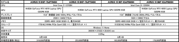 2023年5月30日 - GIGABYTE Technology Co., Ltd. 台湾・新北市 - コンピュータテクノロジーで世界をリードするGIGABYTE Technologyは、CPUに第13世代または第12世代Intel Coreプロセッサシリーズ、GPUにNVIDIA GeForce RTX 40シリーズを搭載した新しい15.6型ゲーミングノートPC「AORUS 15シリーズ」4モデルをGIGABYTEノートPC取扱店を通して6月1日より順次販売を開始いたします。