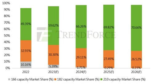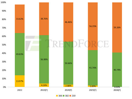 ウェーハについては、2023年には大判ウェーハの需要増加が加速し、その市場シェアは2022年の83.45%から95.74%に急拡大するとTrendForceは予測しています。 2023年の大判ウェーハの生産能力は792.4GWに達し、、大判化への傾向がより強くなる一方、210mmウェーハの生産能力は320.8GWに達し、74.6%増で市場シェアは38.76%になると予測しています。
