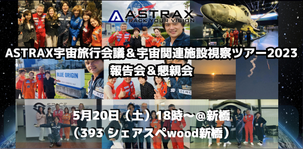 世界中の人々の夢を宇宙で実現させる民間宇宙サービスプラットフォームを提供する宇宙ベンチャー企業株式会社ASTRAX(アストラックス、以下 ASTRAX、本社:神奈川県鎌倉市、代表:代表取締役・民間宇宙飛行士 TAICHI(山崎大地))は、2023年4月27日から5月4日の日程で実施した「ASTRAX宇宙旅行会議&宇宙関連施設視察ツアー2023」の報告会と懇親会を2023年5月20日に、東京都港区にある「393 シェアスペwood新橋」にて開催しました。
