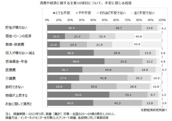 不安の度合いが大きかったのは「物価が上昇する」で、とても不安(54.0%)、やや不安(33.1%)の合計87.1%が「不安」と評価している。その他、不安の度合いが大きかったのは「老後資金・年金」(とても不安(49.9%)、やや不安(33.0%)の合計82.9%が「不安」)、「貯金が増えない」(とても不安(42.4%)、やや不安(39.7%)の合計82.1%が「不安」)、「収入が増えない・減る」(とても不安(40.6%)、やや不安(39.9%)の合計80.5%が「不安」)となっている。