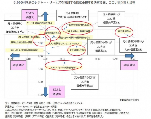 1回1人当たり3,000円未満のレジャー・サービス(例:外食、映画、カラオケ、ショッピング等)を利用する際の決定要素を12項目あげて、それぞれの重要度について、10点満点の評価で回答を得た。また、現在(調査時点=2023年3月)の評価と共に、新型コロナウイルス感染拡大前(2019年末~2020年3月頃)の時点での評価を思い出してもらい、10点満点で評価を尋ねた。
