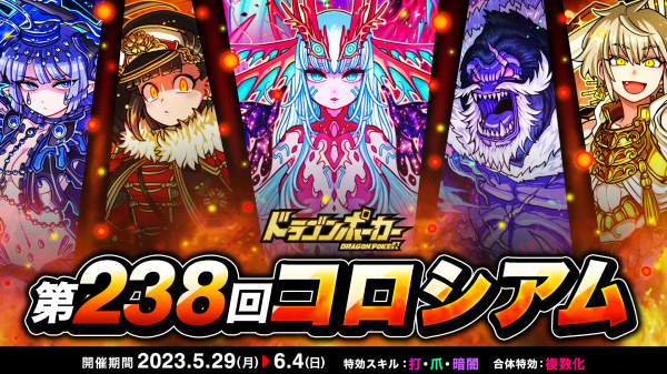 株式会社アソビズム(本社:東京都千代田区、代表取締役:大手智之)は、App Store・Google Playにて好評配信中のリアルタイム合体カードバトル『ドラゴンポーカー』で、2023年5月29日(月)より「第238回コロシアム本戦」を開催いたします。