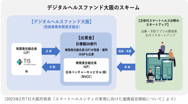 TISインテックグループのTIS株式会社(本社:東京都新宿区、代表取締役社長:岡本 安史、以下:TIS)は、日本ベンチャーキャピタル株式会社(本社:東京都千代田区、代表取締役社長:多賀谷 実、以下:NVCC)の運営するファンド「デジタルヘルスファンド大阪」へLP(Limited Partner:有限責任組合員)※1 として出資したことを2023年5月29日に発表しました。