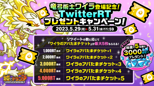 5月29日(月)より、転生シリーズ第3弾“竜弓術士ワイラ”の登場を記念した「竜弓術士ワイラ登場記念!TwitterRTプレゼントキャンペーン」を開催!『城とドラゴン』公式Twitterアカウント(@shirotodoragon)がつぶやいたキャンペーン対象ツイートの公式リツイート総数に応じて、「ワイラのアバたま」に使用できる “ワイラのアバたまチケット”をユーザー全員にプレゼント!さらにWチャンスとして、リツイートされた方の中から抽選で5名様に、3000ルビーをプレゼントします。