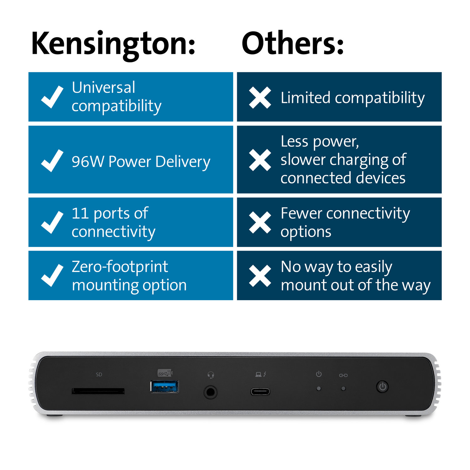 ノートPC搭載ポートはテクノロジーの進化に伴い最大40Gbpsのデータ転送速度を持つThunderbolt3ポートまたは最新のThunderbolt4ポートが主流になってきています。KensingtonはThunderbolt4、Thunderbolt3、USB-Cポート搭載のノートPCに対応したドッキングステーション製品を発売し、デバイスの性能を最大限に引き出すドッキングステーションの製品拡充を行っていきます。