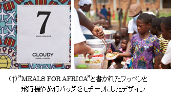 なお、本商品の売上の一部は、NPO法人CLOUDYを通じて、アフリカでガーナの子どもたち、そしてその家族のライフラインとなる給食を提供する資金に還元されます。手に取った方にこの取り組みを分かりやすく伝えるため、すべての商品に “MEALS FOR AFRICA”と書かれたワッペンが付いています。