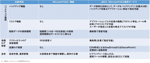 今回の運用サービスでは、利用中のMicrosoft365のバックアップ、ログ保管、運用サービスをJBCCが一貫して提供するため、ユーザーのシステム部門にとっては、データやログの保全が図れるだけでなく、作業漏れの防止や、作業負荷の大幅な軽減も期待できます。