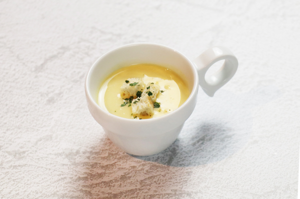 今回初登場の冷製コーンスープは、香味野菜と合わせて炒めたコーンを、何度も裏ごしして滑らかに仕立てました。優しい甘さと奥行のある、まろやかな味わいの冷製スープとなっております。