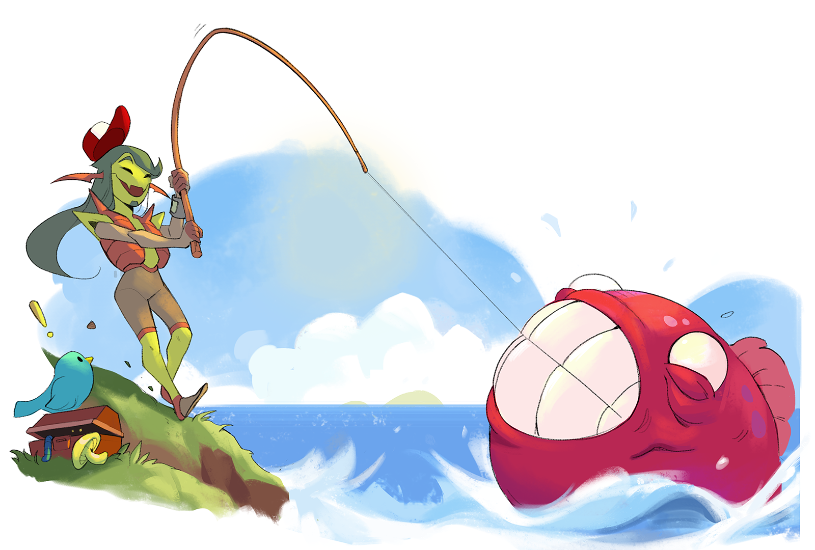 『メグとばけもの』から釣り好きな魔物、ゴランが、モバイル版でも登場します!ゴールドスポンサー(有料)になったプレイヤーの方は「変化の術」から、ゴランに変身して釣りを楽しむことができます。