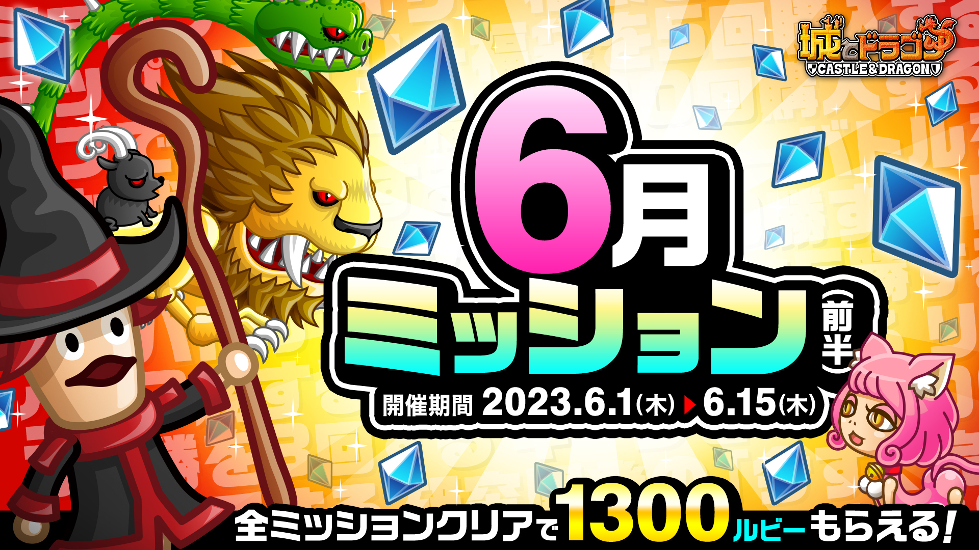 6月1日(木)よりミッションクリアで最高1300ルビーがもらえる「6月ミッション(前半)」を開催いたします。“リーグで3勝する”など、用意されたさまざまな「ミッション」を達成すると最高1300ルビーを獲得することができます。