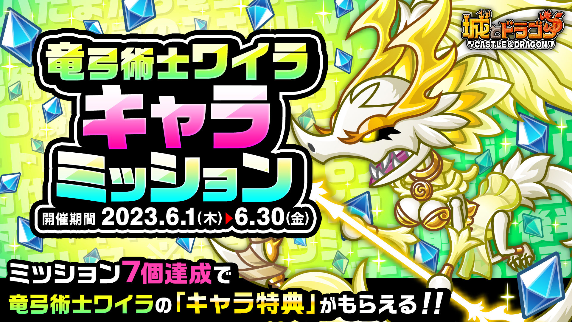 転生シリーズ第3弾“竜弓術士ワイラ”の登場を記念したキャンペーンやイベントが開催! 6月1日(木)より最大“1000ルビー”や豪華アイテムがもらえる「竜弓術士ワイラ登場ログインボーナス」や、規定数のミッションクリアで“竜弓術士ワイラ”の「キャラ特典」などがもらえる「竜弓術士ワイラキャラミッション」、そして“竜弓術士ワイラ”を使用してクリアを目指すキャラ討伐やレア城主イベントがスタート!皆様のご参加をお待ちしています!