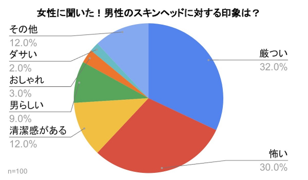 「スキンヘッドの男性に対する印象を教えてください。」の質問では、『厳つい』が32%、『怖い』が30%、『清潔感がある』が12%、『男らしい』が9%、『おしゃれ』が3%、『ダサい』が2%、『その他』が12%となり、厳つい、怖いという印象が多数を占める結果となりました。