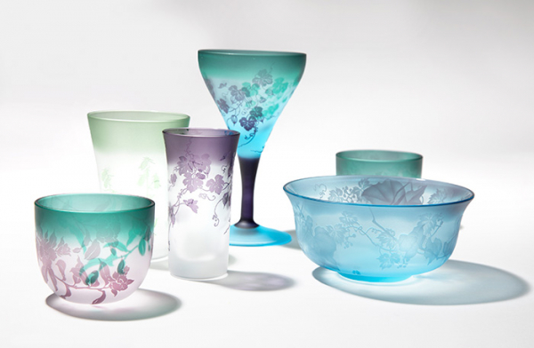 繊細でおぼろげな風合いが美しい北島雅子さんの硝子。北海道はニセコ、羊蹄山の麓の自然をモチーフに、サンドブラスト技法で製作した硝子の器は、涼やかな夏へ誘ってくれるよう。