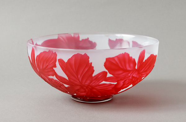 サンドブラストとは、硬くて細かい砂(金剛砂など)を高圧で吹き付けガラスなど素材の表面を削り取ることでデザインを表現する技法。もとは工業用の錆落としとして1870年アメリカで開発され、当時はショットブラストと呼ばれ、20世紀に入って美術工芸用として改良されたのがサンドブラストです。日本には明治末頃に入ってきました。