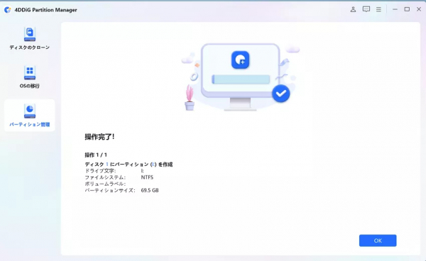 4DDiG Partition Managerの操作がわかりやすく簡単で、数ステップの操作で完結しますので、パソコンの操作に不安がある方におすすめです。パーティションの作成のみならず、縮小・拡張・削除・フォーマットもサポートしています。データを失うことなく、HDDをアップグレードすることもできます。