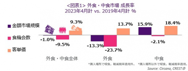 外食・中食市場の2023年4月は、売上1.0%減(2019年同月比)
