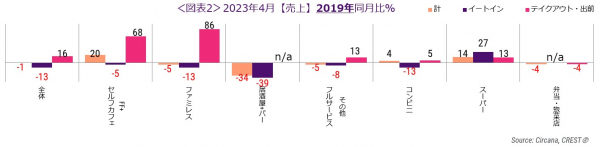 業態別・利用形態別の2023年4月の売上2019年同月比をみると(図表2)、外食・中食全体のイートインは同13.3%減と前月比1.0ポイント増でした。テイクアウト・出前は、FF+セルフカフェ(2019年同月比68%増)とFRが(同86%)好調でした。