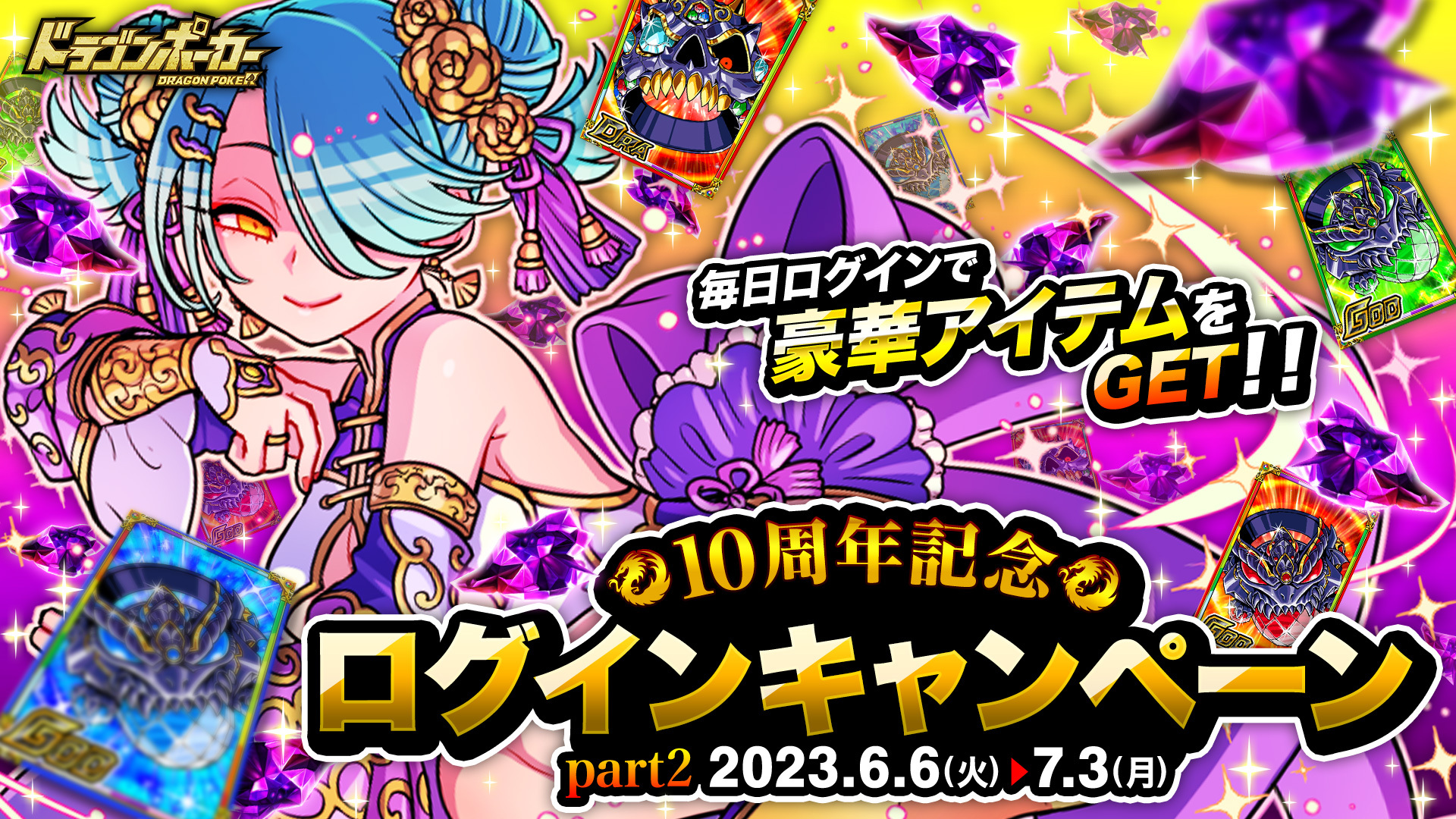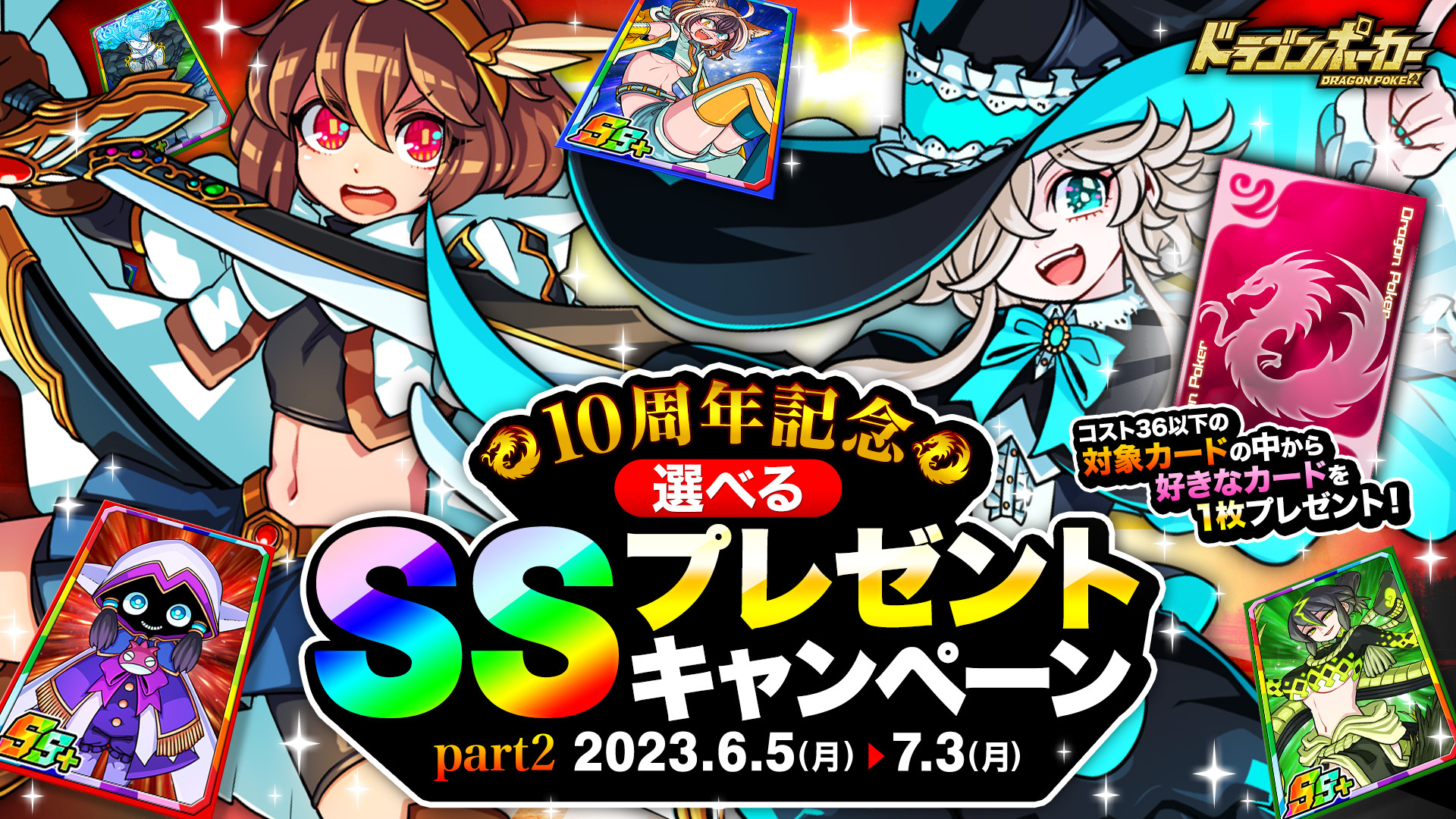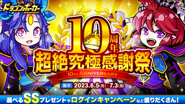 おかげさまで『ドラゴンポーカー』は、2023年5月17日(水)にサービス開始10周年を迎えました。これを記念し、6月5日(月)より「10周年超絶究極感謝祭(後半)」を開催いたします。好きなSSキャラが必ずもらえる「選べるSSプレゼントキャンペーン」や毎週末SSレアガチャチケットがもらえる「10周年記念週末お楽しみプレゼント」など、前半に引き続き様々なキャンペーンを開催いたします。「10周年超絶究極感謝祭(後半)」もどうぞお楽しみください!
