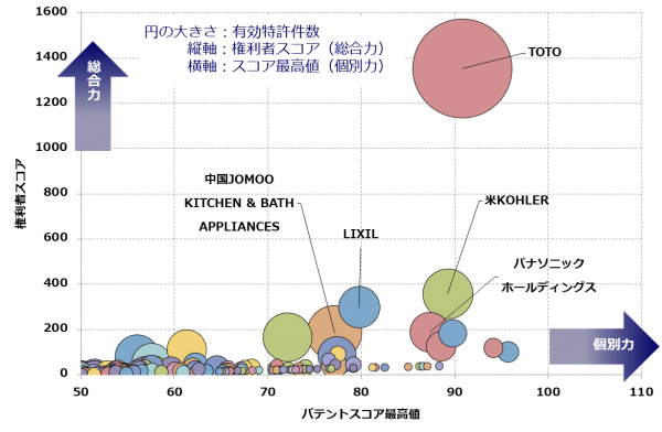 中国では、観光地などにおける公衆トイレの衛生環境を改善するため、2015年に「トイレ革命」が提唱されて以降、トイレの整備が急速に推し進められてきました。本調査では、水洗トイレの便器に関する技術について、個別特許の注目度を得点化する「パテントスコア」をベースに、中国特許の質と量から総合的に見た評価を行いました。