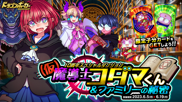 株式会社アソビズム(本社:東京都千代田区、代表取締役:大手智之)は、App Store・Google Playにて好評配信中のリアルタイム合体カードバトル『ドラゴンポーカー』で、2023年6月5日(月)より10周年スペシャルダンジョン「仮魔導士コダマくん&ファミリーの秘密」を開催いたします。