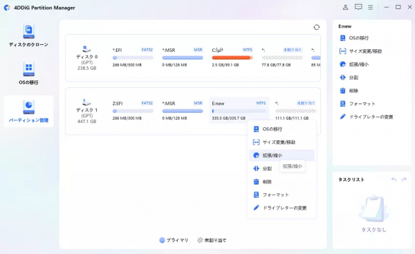 手順1.4DDiG Partition Managerをダウンロードして起動します。左側の「パーティション管理」を選択します。次に、拡張するパーティションを右クリックし、「拡張/縮小」を選択します。
